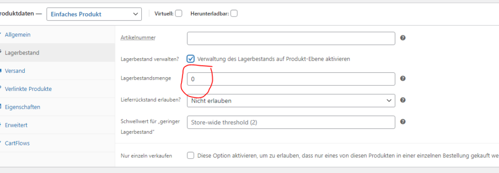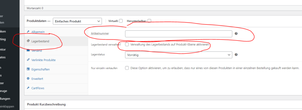 - 9. Beim Lagerbestand schreibst du die Artikelnummer des Artikels und die Lagerbestandsmenge hinein. Beides findet man auf der Excelliste. (Die Lagerbestandsmenge kannst du erst eingeben, wenn du das Kästchen «Verwaltung des Lagerbestands auf Produkt-Ebene aktivieren») anklickst.